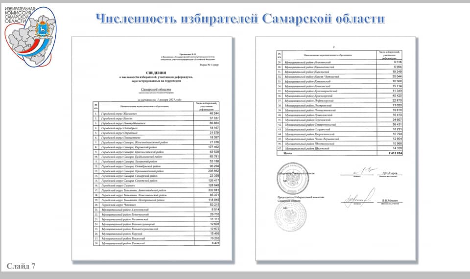 В соответствии с пунктом 10 статьи 16 Федерального закона от 12.06.2002 № 67-ФЗ «Об основных гарантиях избирательных прав и права на участие в референдуме граждан Российской Федерации» с использованием базы данных Государственной автоматизированной системы Российской Федерации «Выборы» установлена численность избирателей, участников референдума, зарегистрированных на территории Самарской области по состоянию на 1 января 2021 года.