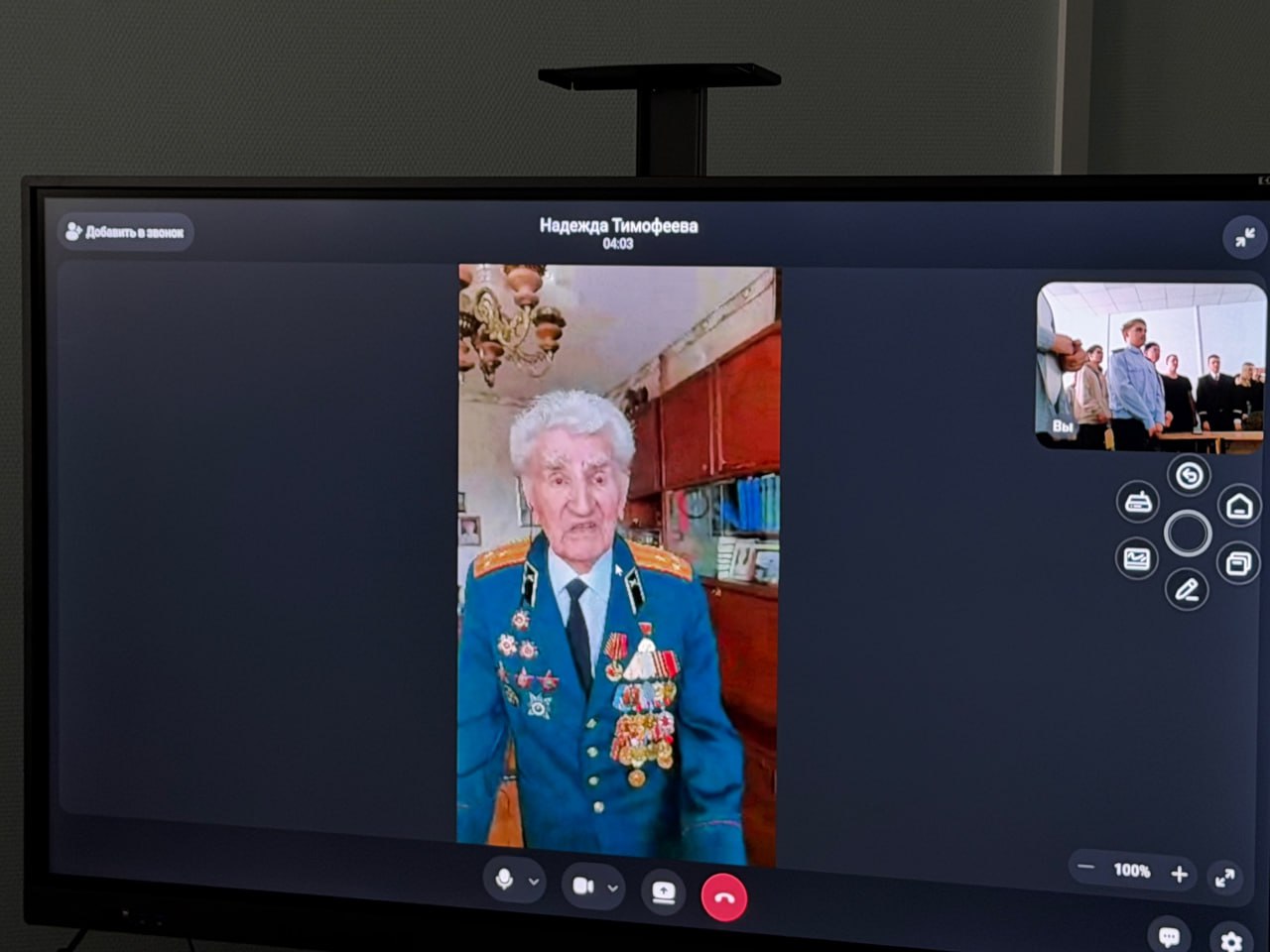 Кульминационным моментом сегодняшнего мероприятия стал телемост с участником Великой Отечественной войны, полковником в отставке, кавалером трех орденов Красной Звезды и двух орденов Отечественной войны — Виталием Ивановичем Колесовым.